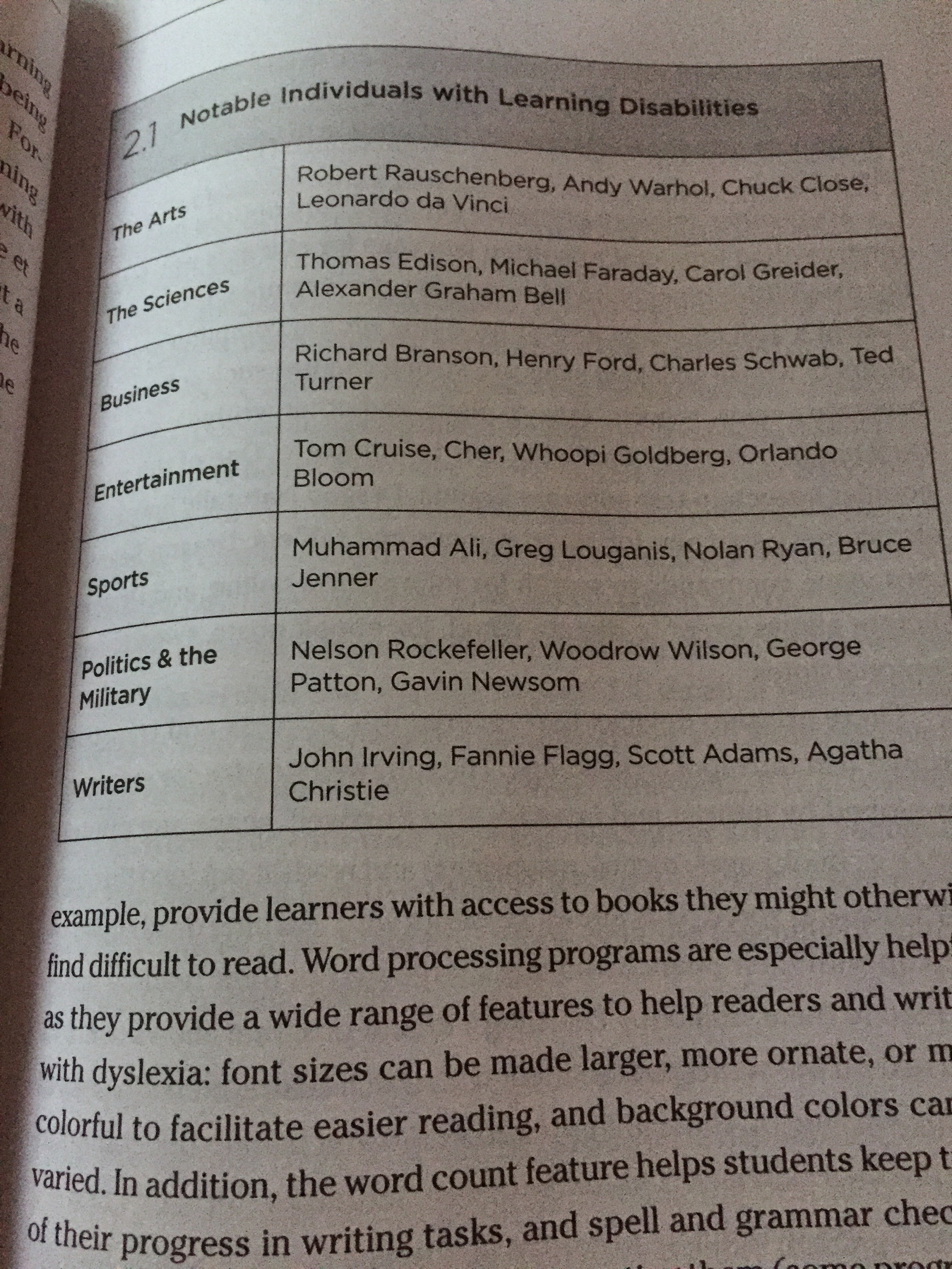 Each chapter in the book discusses various things students with neurodiversities need in the classroom and life to help them succeed (such as strength awareness and assistive technology), but one thing in particular which I really like is the inclusion of positive role models and success stories. Kids love to hear, see, and read about famous people who are like them. Knowing that they are struggling and that these people who have the same neurodiversities as them also struggled, but made it through and greatly succeeded is exactly what students need.
