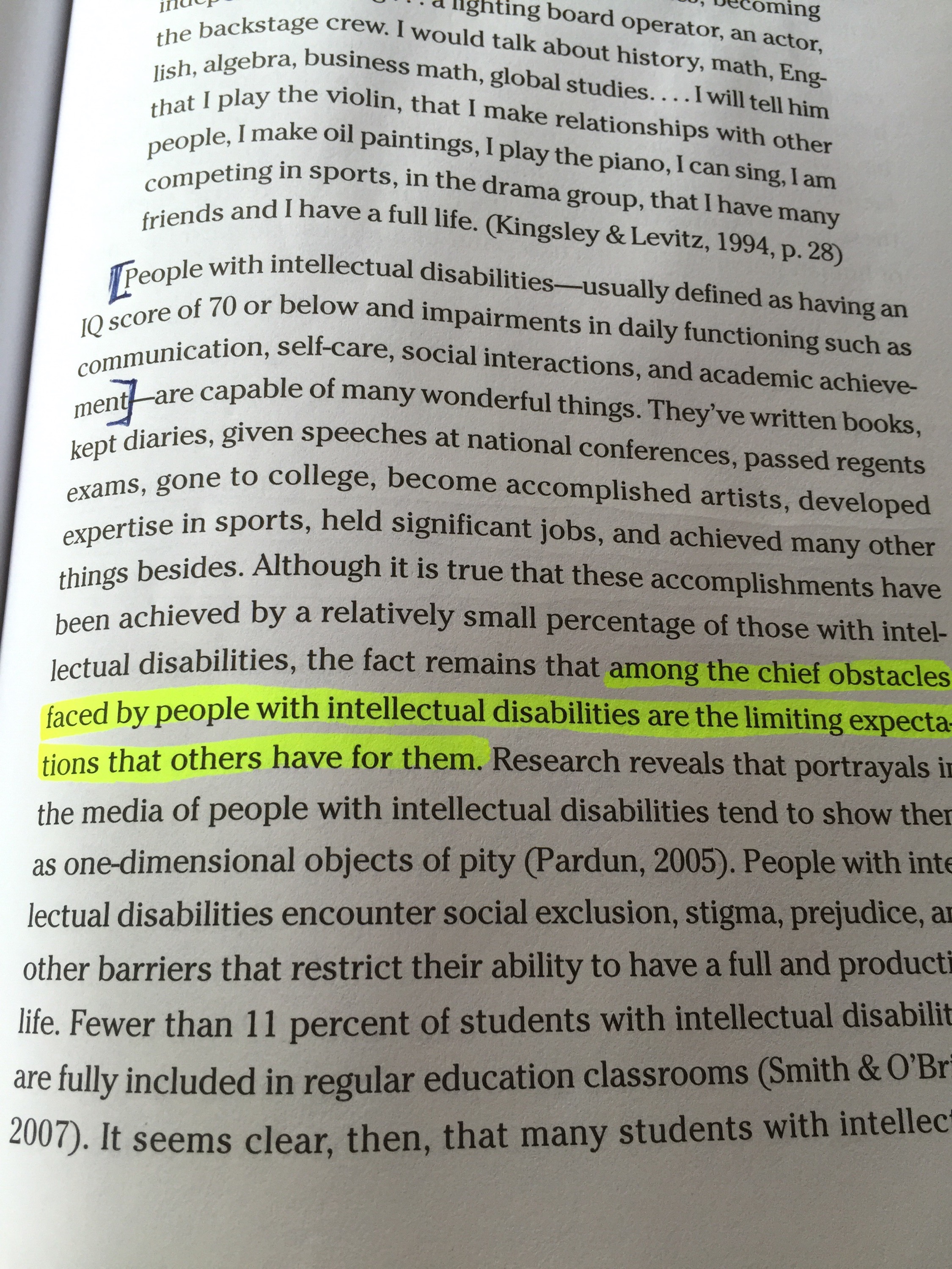 The most intriguing (and accurate) quote I found in this chapter stated that the largest obsticle faces by individuals with intellectual disabilities is that others place low expectations on them.